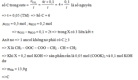 Đốt cháy hoàn toàn m gam este hai chức, mạch hở X (được tạo bởi axit cacboxylic no, đa chức và hai ancol đơn chức, phân tử X có không quá 5 liên kết π) cần 0,3 mol O2, thu được 0,5 mol hỗn hợp CO2 và H2O. Khi cho m gam X tác dụng hoàn toàn với 200 ml dung dịch KOH 1M, cô cạn dung dịch thì thu được khối lượng chất rắn là