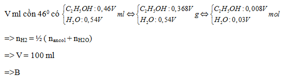 Cho Na dư vào V ml cồn 460 ( khối lượng riêng của ancol etylic nguyên chất là 0,8g/ml) thu được 42,56 lit H2 (dktc). Giá trị của V là :