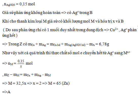 Lắc 13,14g Cu với 250 ml dung dịch AgNO3 0,6 M một thời gian thu được 22,56g chất rắn A và dung dịch B. Nhúng thanh kim loại M nặng 15,45g vào dung dịch B khuấy đều đến khi phản ứng hoàn toàn thu được dung dịch chỉ chứa một muối duy nhất và 17,355g chất rắn Z. Kim loại M là :