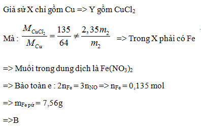 Cho m1 gam hỗn hợp Fe và Cu vào dung dịch HNO3 loãng thu được 2,016 lit khí NO (dktc) là sản phẩm khử duy nhất và m2 gam chât rắn X. Đun nóng m2 gam chất rắn Y với khí Clo thu được 2,35m2 gam chất rắn Y. Khối lượng kim loại phản ứng với axit là :
