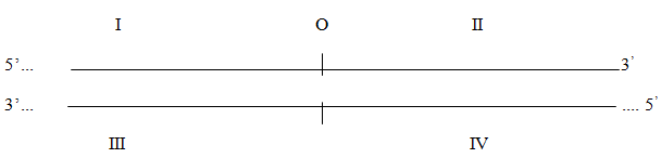 Cho một đoạn ADN ở khoảng giữa 1 đơn vị sao chép như hình vẽ: O là điểm khởi đầu sao chép, I, II, III, IV chỉ các đoạn mạch đơn của ADN.