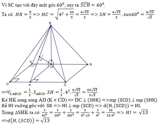 Cho hình chóp S.ABCD có đáy là hình vuông cạnh bằng 4. Mặt bên (SAB) nằm trong mặt phẳng vuông góc với đáy, hình chiếu vông góc của S trên mặt đáy là điểm H thuộc đoạn AB sao cho BH = 2AH. Góc giữa SC và mặt phẳng đáy là 600. Tính thể tích khối chóp S.ABCD và khoảng cách từ điểm H đến mặt phẳng (SCD).
