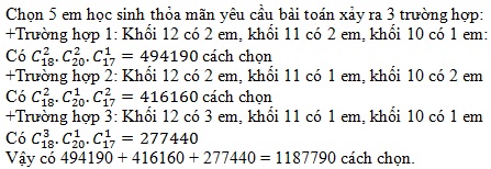 Câu 4. Một trường có 55 đoàn viên học sinh tham dự đại hội Đoàn trường, trong đó khối 12 có 18 em, khối 11 có 20 em và 17 em khối 10. Đoàn trường muốn chọn 5 em để bầu vào ban chấp hành nhiệm kì mới. Hỏi có bao nhiêu cách chọn sao cho 5 em được chọn có cả 3 khối, đồng thời có ít nhất 2 em học sinh khối 12.