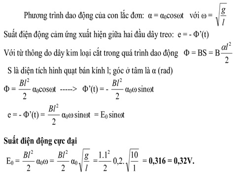 Một con lắc đơn gồm 1 dây kim loại nhẹ dài 1m , dao động điều hòa với biên độ góc 0,2 rad trong một từ trường đều mà cảm ứng từ có hướng vuông góc với mặt phẳng dao động của con lắc và có độ lớn 1T. Lấy g = 10m/s2. Tính suất điện động cực đại xuất hiện trên thanh treo con lắc