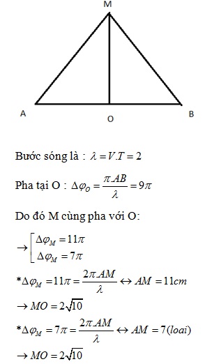 Ở mặt chất lỏng có hai nguồn sóng A, B cách nhau 18 cm, dao động theo phương thẳng đứng với phương trình là uA = uB = acos50πt (với t tính bằng s). Tốc độ truyền sóng của mặt chất lỏng là 50 cm/s. Gọi O là trung điểm của AB, điểm M ở mặt chất lỏng nằm trên đường trung trực của AB và gần O nhất sao cho phần tử chất lỏng tại M dao động cùng pha với phần tử chất lỏng tại O. Khoảng cách MO là