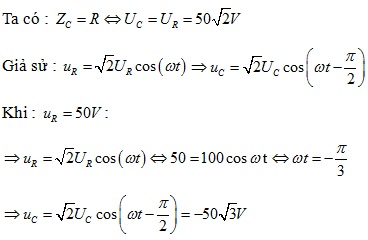 cos(ωt) V vào hai đầu mạch gồm điện trở R nối tiếp với tụ C có ZC = R. Tại thời điểm điện áp tức thời trên điện trở là 50V và đang tăng thì điện áp tức thời trên tụ là