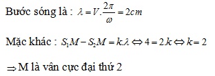 Trên mặt nước nằm ngang có hai nguồn sóng S1, S2 dao động theo phương thẳng đứng với phương trình u1=u2=5cos(20πt+π)cm và tạo ra hiện tượng giao thoa sóng. Vận tốc truyền sóng trên mặt nước là 20cm/s. Một điểm M trên mặt nước cách S1 đoạn 16cm và cách S2 đoạn 20cm. Điểm M thuộc đường