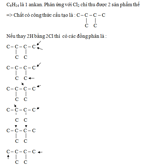 Hợp chất C6H14 khi phản ứng với Clo có ánh sáng thì thu được hỗn hợp 2 sản phẩm đồng phân C6H13Cl . Nếu thay 2 nguyên tử H của C6H14 bằng 2 nguyên tử Clo thì sẽ tạo ra hỗn hợp gồm số lượng đồng phân là :