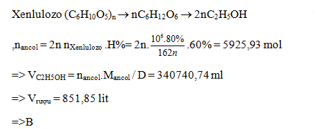 Thủy phân hết một tấn mùn cưa chứa 80% xenlulozo rồi cho lên men rượu với hiệu suất 60%. Biết khối lượng riêng của C2H5OH nguyên chất là 0,8g/ml.Thể tích rượu 400 thu được là