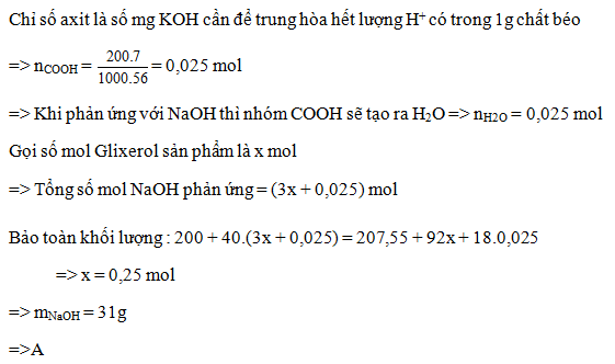 Cho 200 gam một loại chất béo có chỉ số axit bằng 7 tác dụng vừa đủ với một lượng NaOH thu được 207,55 gam hỗn hợp muối khan. Khối lượng NaOH đã tham gia phản ứng là
