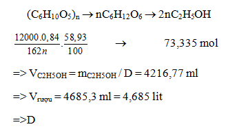 Từ 12kg gạo nếp (có 84% tinh bột) lên men thu được V lít cồn 900. Biết khối lượng riêng của C2H5OH là 0,8g/ml, hiệu suất của toàn bộ quá trình là 58,93 %. Giá trị của V là