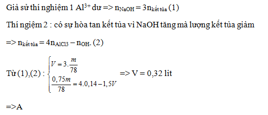 Cho V lít dung dịch NaOH 1M vào dung dịch chứa 0,14 mol AlCl3, thu được m gam kết tủa. Mặt khác, cho 1,5V lít dung dịch NaOH 1M vào dung dịch chứa 0,14 mol AlCl3, thu được 0,75m gam kết tủa. Giá trị của V là