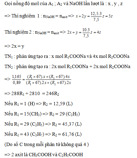 Có 2 dung dịch axit no đơn chức A1 và A2. Trộn 1 lít A1 với 2 lít A2 thu được 3 lít dung dịch X để trung hòa dung dịch 7,5 ml X cần dùng với 12,5 ml dung dịch NaOH (dung dịch B) và tạo ra 1,165 gam muối khan. Trộn 2 lít A1 với 1 lít A2 thu được 3 lít dung dịch Y. Để trung hòa 7,5 ml Y cần 10 ml dung dịch B và tạo ra 0,89 gam muối khan Xác định công thức A1 và A2 biết rằng số nguyên tử C trong mỗi phân tử không quá 4.