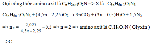 X là một tripeptit được tạo thành từ 1 aminoaxit no, mạch hở có 1 nhóm -COOH và 1 nhóm -NH2. Đốt cháy hoàn toàn 0,3 mol X cần 2,025 mol O2 thu đươc sản phẩm gồm CO2, H2O, N2. Vậy công thức của amino axit tạo nên X là