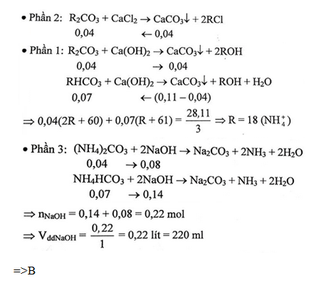 Hòa tan hoàn toàn 28,11 gam hỗn hợp gồm 2 muối R2CO3 và RHCO3 vào nước, thu được dung dịch X. Chia X thành 3 phần bằng nhau. Phần một tác dụng hoàn toàn với dung dịch Ca(OH)2 dư, thu được 11 gam kết tủa. Phần hai tác dụng hoàn toàn với dung dịch CaCl2 dư, thu được 4 gam kết tủa. Phần ba phản ứng vừa đủ với V ml dung dịch NaOH 1M. Giá trị của V là