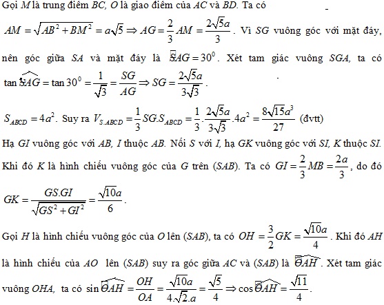 (1,0 điểm): Cho hình chóp S.ABCD có đáy ABCD là hình vuông, cạnh AB = 2a. Hình chiếu vuông góc của S lên mặt phẳng (ABCD) trùng với trọng tâm G của tam giác ABC, góc giữa SA và mặt phẳng (ABCD) bằng 300. Tính theo a thể tích khối chóp S.ABCD và cosin của góc giữa đường thẳng AC và mặt phẳng (SAB).
