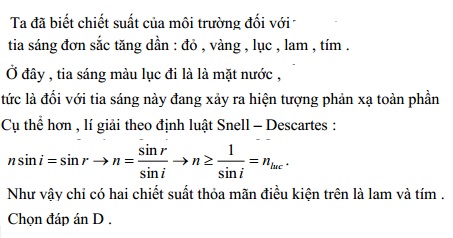 Chiếu từ nước ra không khí một chùm tia sáng song song rất hẹp ( coi như một tia sáng ) gồm 5 phần đơn sắc ; tím, lam, đỏ, lục , vàng. Tia ló đơn sắc màu lục đi là là mặt nước ( sát với mặt phân cách giữa hai môi trường ) . không kể tia đơn sắc màu lục, các tia không ló ra ngoài không khí là các tia đơn sắc màu