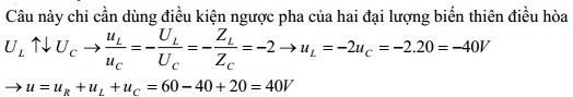 Đặt điện áp xoay chiều vào hai đầu đoạn mạch gồm điện trở thuần , cuộn cảm thuần và tụ điện mắc nối tiếp. Biết cảm kháng của cuộn cảm bằng 2 lần dung kháng của tụ điện. Tại thời điểm t , điện áp tức thời giữa hai đầu điện trở và điện áp tức thời giữa hai đầu tụ điện có giá trị tương ứng là 60V và 20V . Khi đó điện áp tức thời giữa hai đầu đoạn mạch là