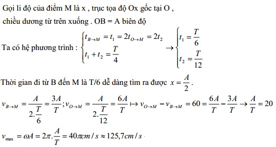 Một lò xo nhẹ treo thẳng đứng, đầu dưới của lò xo treo vật nhỏ có khổi lượng m . Từ vị trí cân bằng O , kéo vật thẳng đứng xuống dưới đến vị trí B rồi thả không vận tốc ban đầu. Gọi M là vị trí nằm trên OB , thời gian ngắn nhất để vật đi từ O đến M gấp hai lần nhau. Biết tốc độ trung bình của vật trên các quãng đường này chênh lệch nhau 60 cm/s / Tốc độ cực đại của vật có giá trị xấp xỉ bằng