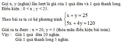 Số tiền mua 1 quả dừa và một quả thanh long là 25 nghìn đồng. Số tiền mua 5 quả dừa và 4 quả thanh long là 120 nghìn đồng. Hỏi giá mỗi quả dừa và giá mỗi quả thanh long là bao nhiêu ? Biết rằng mỗi quả dừa có giá như nhau và mỗi quả thanh long có giá như nhau.