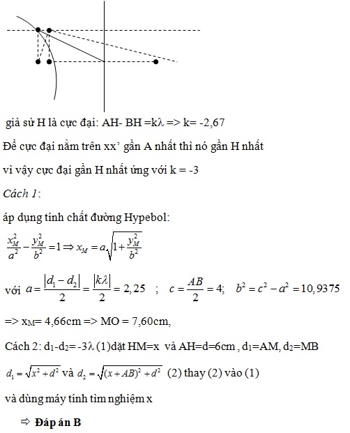Trên mặt nước có hai nguồn kết hợp A, B cách nhau 8 cm, dao động cùng pha với bước sóng phát ra là 1,5cm. Một đường thẳng xx’ // AB và cách AB một khoảng 6 cm. M là điểm dao động với biên độ cực đại trên xx’ và gần A nhất. Hỏi M cách trung điểm của AB một khoảng bằng bao nhiêu?