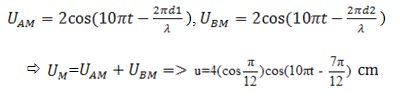 Trên mặt thoáng của chất lỏng có hai nguồn kết hợp A, B có phương trình dao động là uA = uB = 2cos10t(cm). Vận tốc truyền sóng là 3m/s. Viết phương trình dao động sóng tại M cách A, B một khoảng lần lượt là d1 = 15cm; d2 = 20cm