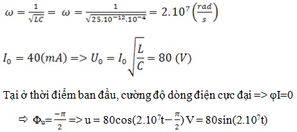 Mạch LC lí tưởng có điện dung C = 25pF và cuộn cảm L = 10-4H. Biết ở thời điểm ban đầu,