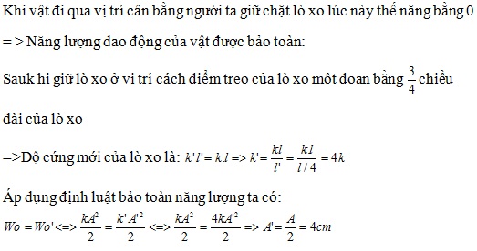 Một con lắc lò xo treo thẳng đứng, vật dao động điều hòa với biên độ 8cm. Khi vật đi qua vị trí cân bằng người ta giữ chặt lò xo ở vị trí cách điểm treo của lò xo một đoạn bằng