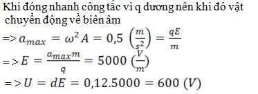 Một con lắc đơn có chiều ℓ=1m khối lượng m=50g được treo giữa hai bản kim loại phẳng song song giống hệt nhau đặt thẳng đứng đối diện nhau. Biết hai bản kim loại cách nhau 12cm được nối với nguồn một chiều có hiệu điện thế U(V) qua một công tắc K, công tắc K ban đầu mở. Lấy gia tốc trọng trường g= 10m/s2. Tích điện cho vật nặng điện tích q =5µC. Khi vật đang đứng yên thì đóng nhanh công tắc K, vật dao động điều hòa với biên độ góc 0,05 rad. Hiệu điện thế U bằng