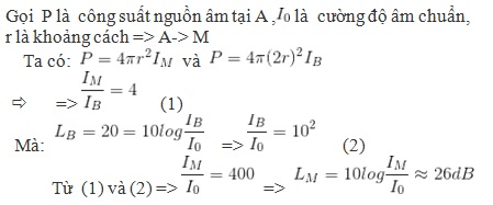 Ba điểm O, A, B cùng nằm trên một nửa đường thẳng xuất phát từ O. Tại O đặt một nguồn điểm phát sóng âm đẳng hướng ra không gian, môi trường không hấp thụ âm. Mức cường độ âm tại A là 60 dB, tại B là 20 dB. Mức cường độ âm tại trung điểm M của đoạn AB là: