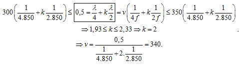 Một âm thoa có tần số 850 Hz được đặt sát một ống nghiệm hình trụ kín đặt thẳng đứng cao 80 cm. Đổ dần nước vào ống nghiệm đến độ cao 30 cm thì thấy âm được khuếch đại lên rất mạnh, biết tốc độ truyền âm trong không khí từ 300 m/s đến 350 m/s. Hỏi khi đổ thêm nước vào ống nghiệm thì có thêm mấy vị trí của mực nước cho âm khuếch đại mạnh?