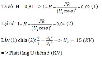 Điện năng ở một trạm phát điện được truyền đi với điện áp hiệu dụng là U=10 KV và công suất truyền đi là P có giá trị không đổi, hệ số công suất bằng 1. Hiệu suất truyền tải điện năng bằng 91%. Để giảm công suất hao phí trên dây chỉ còn 4% công suất truyền đi thì điện áp hiệu dụng nơi truyền đi phải tăng thêm