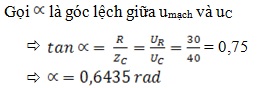 Cho mạch nối tiếp RC, Dùng vôn kế nhiệt có điện trở rất lớn đo được UR = 30 V, UC = 40V, thì hiệu điện thế ở hai đầu đoạn mạch lệch pha so với hiệu điện thế ở hai đầu tụ điện một lượng là