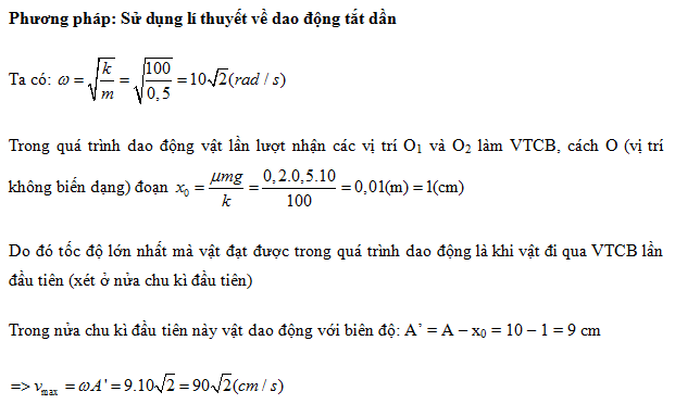 Một con lắc lò xo lí tưởng nằm ngang, lò xo có độ cứng 100 N/m, vật nhỏ có khối lượng 500g. Đưa vật đến vị trí mà lò xo bị nén 10cm, rồi thả nhẹ. Biết hệ số ma sát trượt giữa vật và mặt phẳng nằm ngang là μ = 0,2. Lấy g = 10 m/s2. Vận tốc cực đại của vật trong quá trình dao động là: