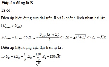 V, ω không đổi. Khi thay đổi giá trị L thì thấy điện áp hiệu dụng cực đại trên R và L chênh lệch nhau 2 lần. Hiệu điện thế hiệu dụng cực đại trên tụ C là
