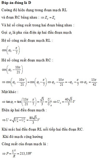 (V) lần lượt vào hai đầu đoạn mạch nối tiếp RL và RC khi đó cường độ dòng điện trong mạch tương ứng là