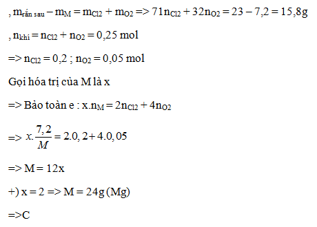 Đốt cháy hoàn toàn 7,2 gam kim loại M (có hoá trị không đổi trong hợp chất) trong hỗn hợp khí Cl2 và O2. Sau phản ứng thu được 23 gam chất rắn và thể tích hỗn hợp khí đã phản ứng là 5,6 lít (ở đktc). Kim loại M là