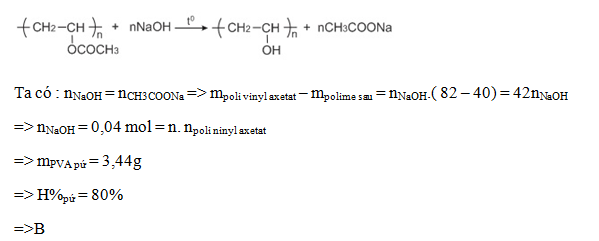Thủy phân 4,3 gam poli(vinyl axetat) trong môi trường kiềm thu được 2,62 gam polime. Hiệu suất của phản ứng thủy phân là
