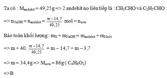 Hỗn hợp X gồm hai este đơn chức, mạch hở là đồng phân cấu tạo của nhau. Cho m gam X phản ứng vừa đủ với dung dịch NaOH, thu được dung dịch Y (chỉ chứa 2 muối) và (m – 14,7) gam hỗn hợp hơi gồm 2 anđehit no, đồng đẳng kế tiếp, có tỉ khối hơi so với H2 bằng 24,625. Cô cạn dung dịch Y thu được (m – 3,7) gam chất rắn. Công thức cấu tạo của hai este là