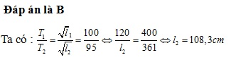 Một con lắc đơn có độ dài ℓ = 120 cm. Người ta thay đổi độ dài của nó sao cho chu kì dao động mới chỉ bằng 95% chu kì dao động ban đầu. Độ dài ℓ’ mới là: