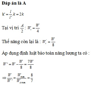 Con lắc lò xo gồm một vật nhỏ gắn với lò xo dao động điều hoà theo phương ngang với biên độ A. Đúng lúc lò xo giãn một đoạn Δℓ = A/2 thì người ta giữ cố định điểm chính giữa của lò xo. Biết rằng độ cứng của lò xo tỉ lệ nghịch với chiều dài tự nhiên của nó. Tỉ số động năng cực đại của vật nặng trước và sau khi giữ lò xo là