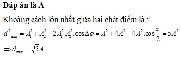 Hai điểm sáng dao động điều hòa trên trục Ox, chung vị trí cân bằng O, cùng tần số f, có biên độ dao động của điểm sáng thứ nhất là A và điểm sáng thứ hai là 2A. Tại thời điểm ban đầu điểm sáng thứ nhất đi qua vị trí cân bằng, điểm sáng thứ hai ở vị trí biên. Khoảng cách lớn nhất giữa hai điểm sáng là