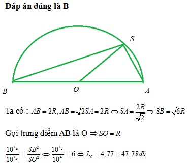 SA. Tại S đặt một nguồn âm đẳng hướng thì mức cường độ âm tại B là 40,00 dB. Mức cường độ âm tại trung điểm AB là