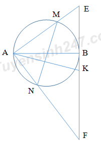 Cho đường tròn tâm O có hai đường kính AB và MN. Vẽ tiếp tuyến d của đường tròn (O) tại B. Đường thẳng AM, AN lần lượt cắt đường thẳng d tại E và F.