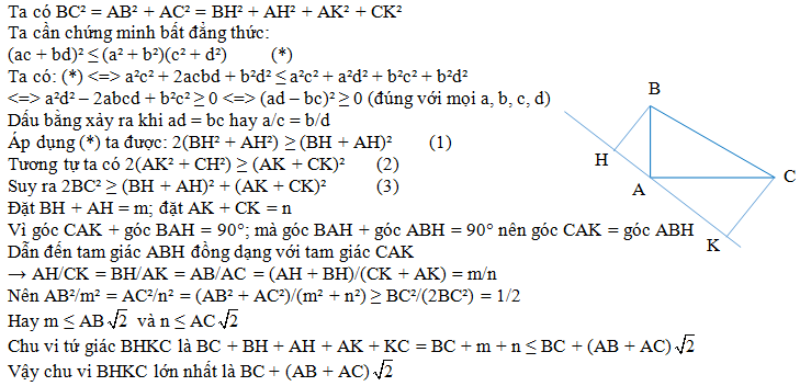 Cho tam giác ABC vuông tại A. Vẽ đường thẳng d đi qua A sao cho d không cắt đoạn BC. Gọi H, K lần lượt là hình chiếu vuông góc của B và C trên d. Tìm giá trị lớn nhất của chu vi tứ giác BHKC.