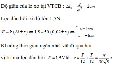 rad/s. Cho g = 10m/s2. Khoảng thời gian ngắn mà vật đi qua hai vị trí mà lực đàn hồi của lò xo có độ lớn 1,5N là