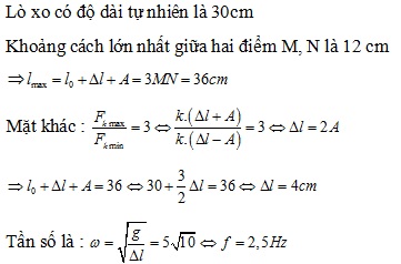 Gọi M, I, N là các điểm trên một lò xo nhẹ, được treo thẳng đứng ở điểm O cố định. Khi lò xo có chiều dài tự nhiên thì OM = MN = NI = 10cm. Gắn vật nhỏ vào đầu dưới I của lò xo và kích thích để vật dao động điều hòa theo phương thẳng đứng . Trong quá trình dao động tỉ số độ lớn kéo lớn nhất và độ lớn lực kéo nhỏ nhất tác dụng lên O bằng 3, lò xo giãn đều, khoảng cách lớn nhất giữa hai điểm M và N là 12cm. lấy