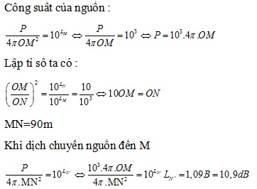 Hai điểm M và N nằm ở cùng một phía của nguồn âm, trên cùng một phương truyền âm và cách nhau một khoảng bằng a, có mức cường độ âm lần lượt là