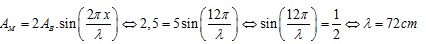 Sóng dừng trên một sợi dây có biên độ ở bụng là 5cm. điểm M có biên độ 2,5cm cách điểm nút gần nhất là 6cm. bước sóng trên dây là