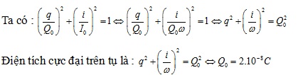thì dòng điện tức thời trong mạch là 0,05A. điện tích lớn nhất trên bản tụ là